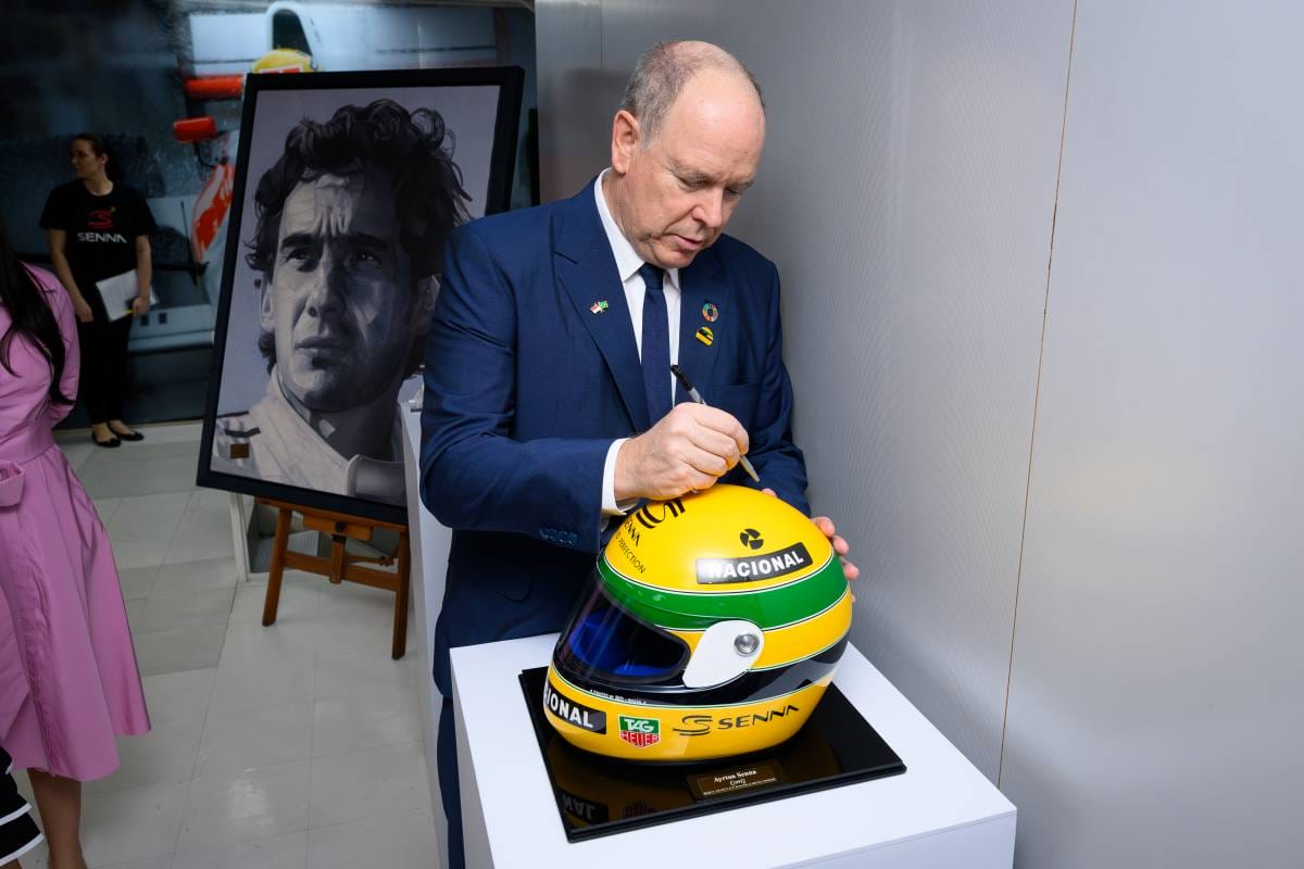 The Prince then visited an exhibition specially prepared for his visit, showcasing a selection of iconic pieces from Ayrton Senna’s personal collection, highlighting his close ties with the Principality.